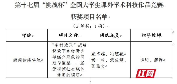 第十七届“挑战杯”全国老员工课外学术科技作品竞赛决赛结果公布,beats365员工梁卓铭、冯瑾艳等同学的作品《“乡村振兴”战略背景下乡村青少年媒介形象的问题与重塑——基于视频社交媒体使用的调研》获全国三等奖。
