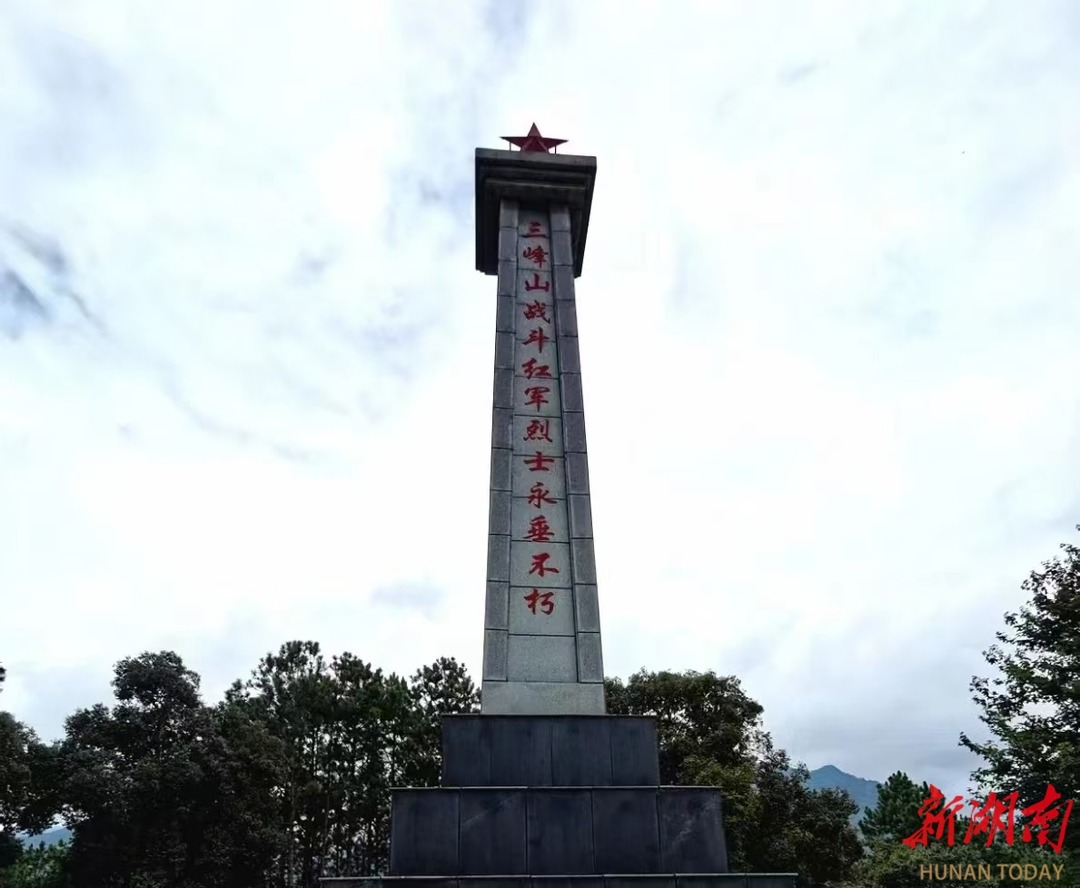 三峰山海拔1528米,山高路陡林密,山中的一条羊肠小道通关广西壮族自治区灌阳县,军事上具有重要意义。80多年前,红八、红九军团为突破敌人的封锁,曾在三峰山与桂系军阀激战3个多小时,留下了光辉的战斗印迹。三峰山战斗红军纪念碑肃立在山顶,上书“三峰山战斗红军烈士永垂不朽”。纪念碑高高耸立,庄严肃穆,周围松柏环绕,不时有过往行人前来祭奠。