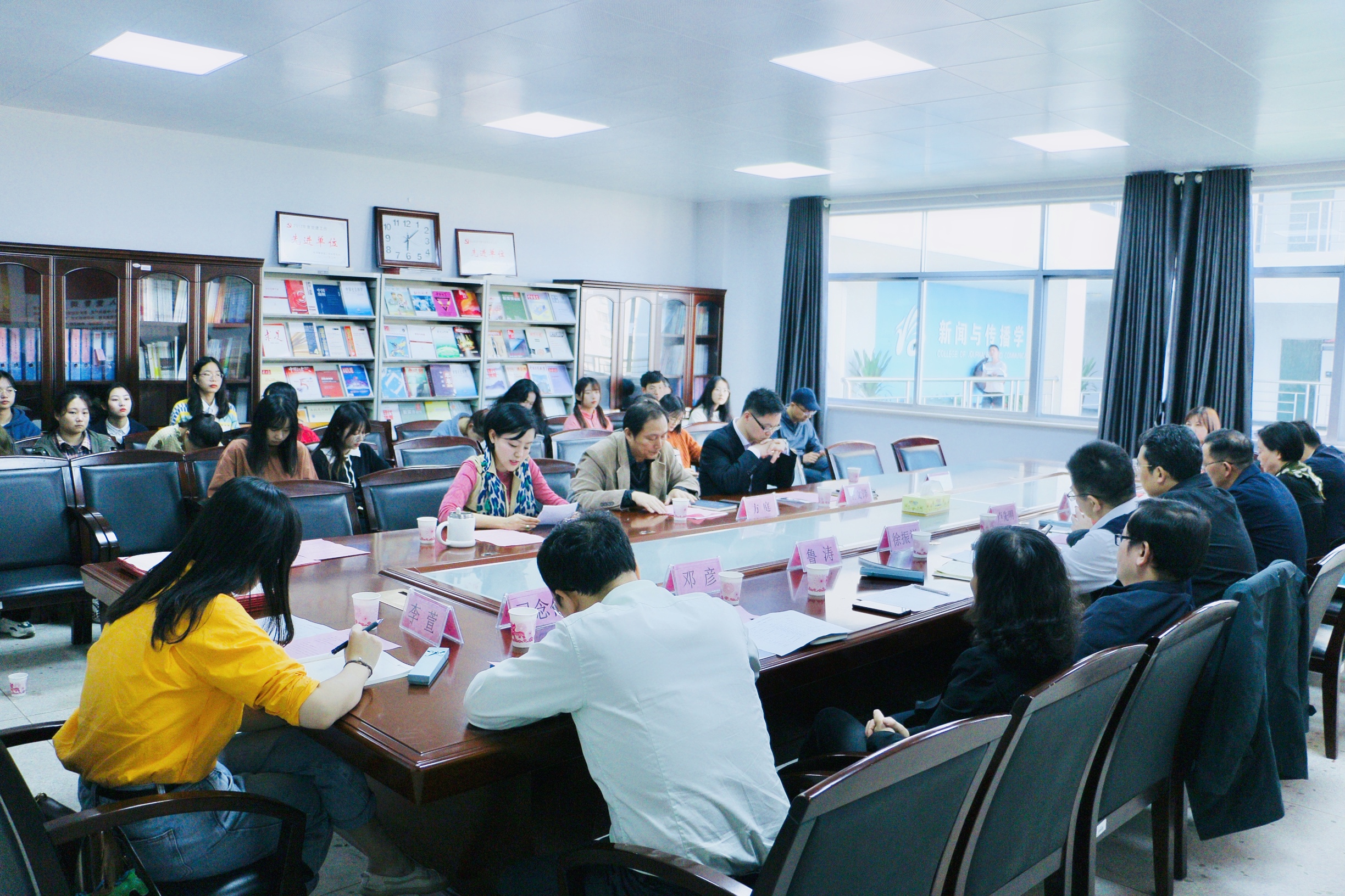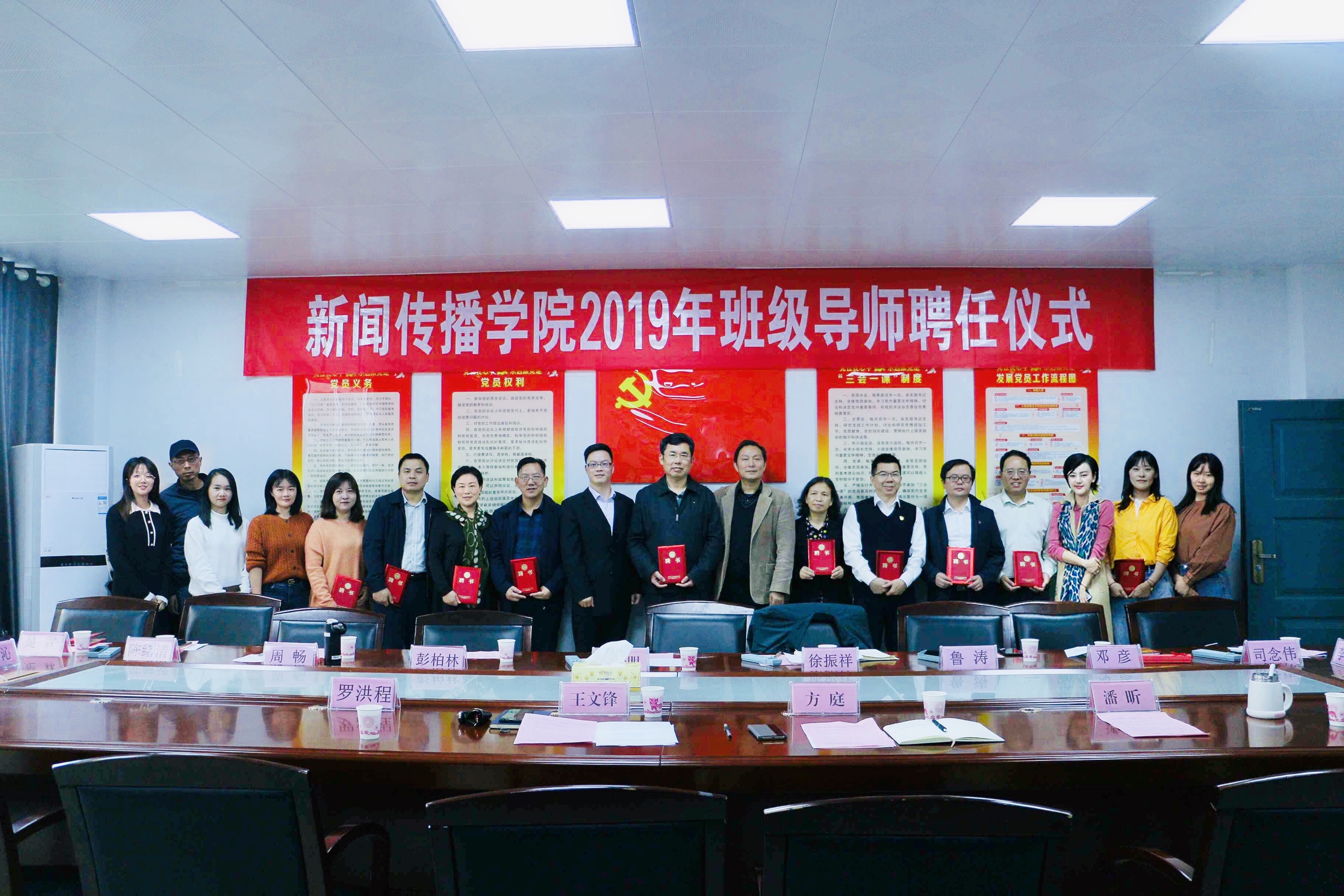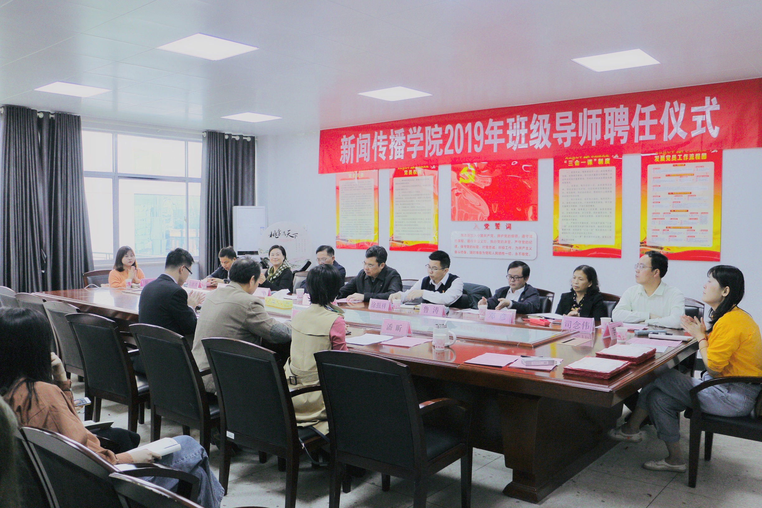 本次活动由beats365经理王文锋主持,党总支书记方庭致辞,副书记潘昕宣读了新闻传播公司党通〔2019〕1101号文件——《关于选聘beats3652019年班级导师的决定》,18、19级班级导师、班主任、辅导员、班长参加了聘任仪式。