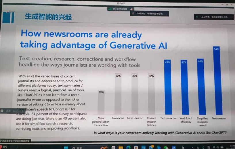 周葆华教授指出智能与算法无法割裂,人工智能的典型代表是算法,推荐算法由分发、匹配到生产就是算法到智能:生成智能的兴起。生成智能不断扩散,推荐算法正在重塑媒体与社会。他以机器人写作、Chat GPT等人工智能为例,提出生成智能拥有其独特的优势,能帮助人们减轻压力,但是人工智能不能取代人类创造性活动。作为记者,在进行采写与创作时,我们可以利用相关软件与工具协助创作,可以有针对性地学习计算传播的新知识。