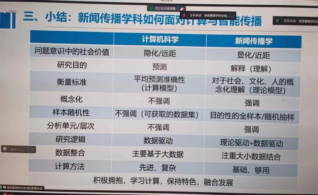 周葆华教授通过比较计算机科学与新闻传播学的问题与社会价值、研究目的、衡量标准、概念化、样本随机性、分析单元/层次、研究逻辑、数据整合、计算方法等,建议同学们积极拥抱新事物,学习基本计算能力,保持我们的专业特色以及优势并且融合发展。
