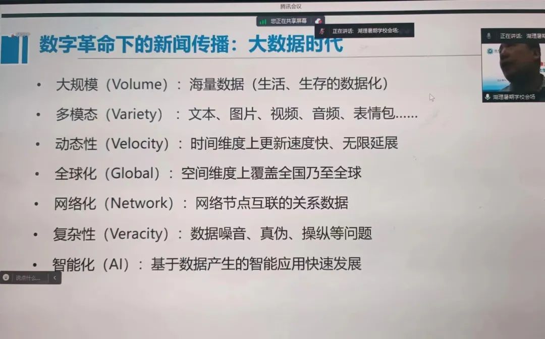 周葆华教授结合自己的亲身经历以及对于日常生活的观察,对于如今数字技术的发展进行了简要讲述。从“ABCDG”五个方面引出数字技术的改变促使云计算、大数据等基础设施的建成与完善。“新的媒介跟大数据的不断突破产生了当下大量的日常生活的数据”。他联系疫情下的生活与“上海人民的一天”,结合当下依靠新媒体“爆火”的旅游景点,认为智能传播与数字革命在一定程度上方便了人们的生活,也促使了新闻传播研究的重大转型。