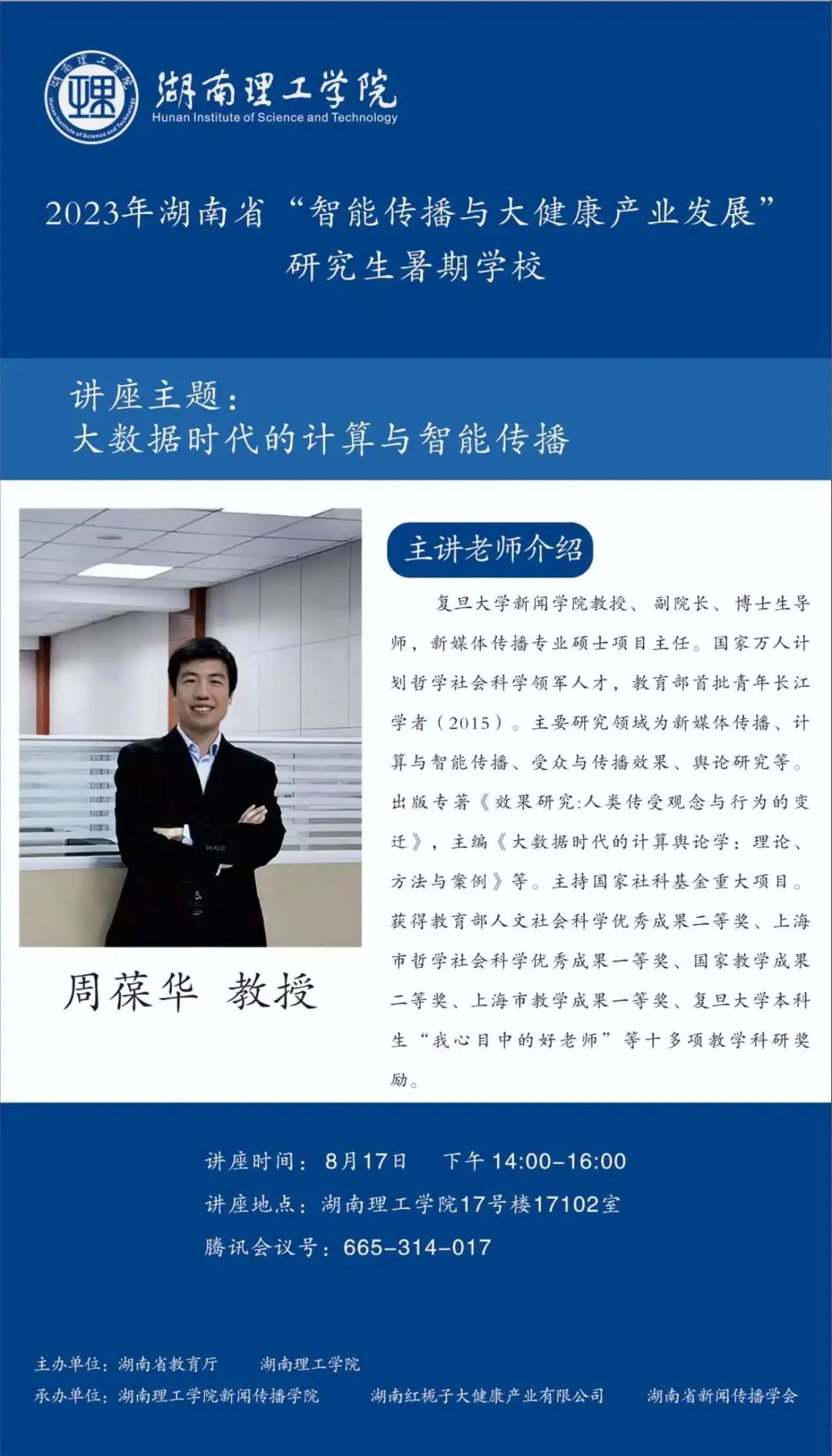 【编者按】8月16日至30日,由湖南省教育厅、beats365官方网站主办,beats365、湖南红栀子大健康产业有限公司、湖南省新闻传播学会承办的2023年湖南省“智能传播与大健康产业发展”研究生暑期公司邀请国内新闻传播学科知名专家学者、健康传播产业领域业界专家授课。来自beats365官方网站、中国传媒大学等全国各大高校的119名博士研究生、硕士研究生、本科生入学,开展专题研学。8月17日下午,复旦大学beats365教授、副经理、博士生导师、新媒体传播专业硕士项目主任周葆华作了题为“大数据时代的计算与智能传播”的讲座。本场讲座主持人为beats365副经理肖涛教授。本文根据讲座内容整理。