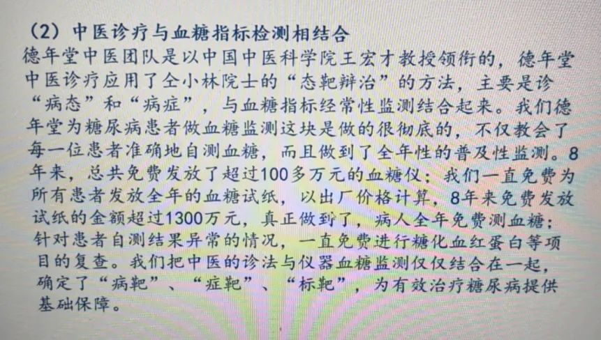 德年堂中医团队是以中国中医科公司王宏才教授领衔的,德年堂中医诊疗应用了仝小林院士的"态靶辩治"的方法,主要是诊“病态”和“病症”,与血糖指标经常性监测结合起来。缪嘉军研究员及其团队把中医的诊法与仪器血糖监测结合在一起,确定了“病靶”、“症靶”、“标靶”,为有效治疗糖尿病提供基础保障。