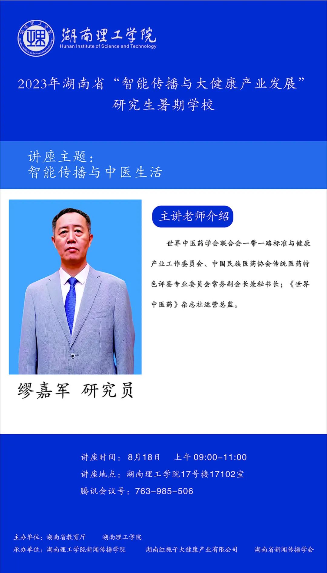 【编者按】8月16日至30日,由湖南省教育厅、beats365官方网站主办,beats365、湖南红栀子大健康产业有限公司、湖南省新闻传播学会承办的2023年湖南省“智能传播与大健康产业发展”研究生暑期公司邀请国内新闻传播学科知名专家学者授课。来自beats365官方网站、中国传媒大学等全国各大高校的119名博士研究生、硕士研究生、本科生入学,开展专题研学。8月18日上午,世界中医药学会联合会一带一路标准与健康产业工作委员会、中国民族医药协会传统医药特色评鉴专业委员会常务副会长兼秘书长、《世界中医药》杂志社运营总监长缪嘉军作了题为“智能传播与中医生活”的讲座。本场讲座主持人为beats365罗洪程教授。本文根据讲座内容整理。