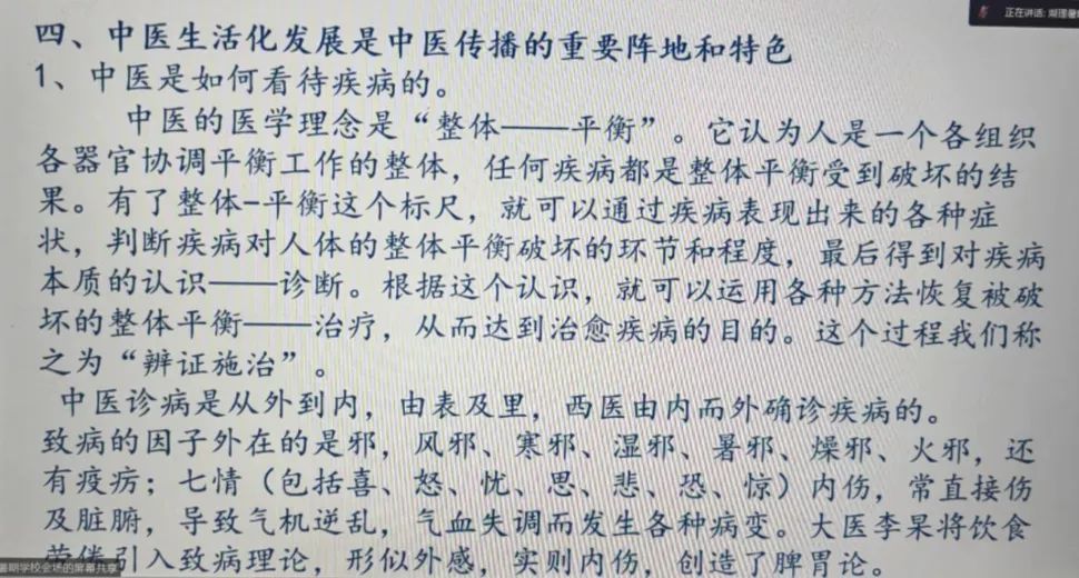 中医的医学理念是“整体——平衡”,它认为人是一个各组织各器官协调平衡工作的整体,任何疾病都是整体平衡受到破坏的结果。有了整体-—平衡这个标尺,通过诊断、治疗,从而达到治愈疾病的目的,这个过程称为“辨证施治”。中医药理论与现代科学学习是两个体系,在基本理论方面互不兼容。中医的智慧包括:天人合一、整体观、辩证论治、治未病、和合等。缪嘉军研究员表示学习中医是人的文脉的一部分,目前中医的问题是边界模糊,边界感不强,但这也是优势,生活内容丰富,从生活智慧中汲取中医营养,是现代普及中医非常好渠道和特色。