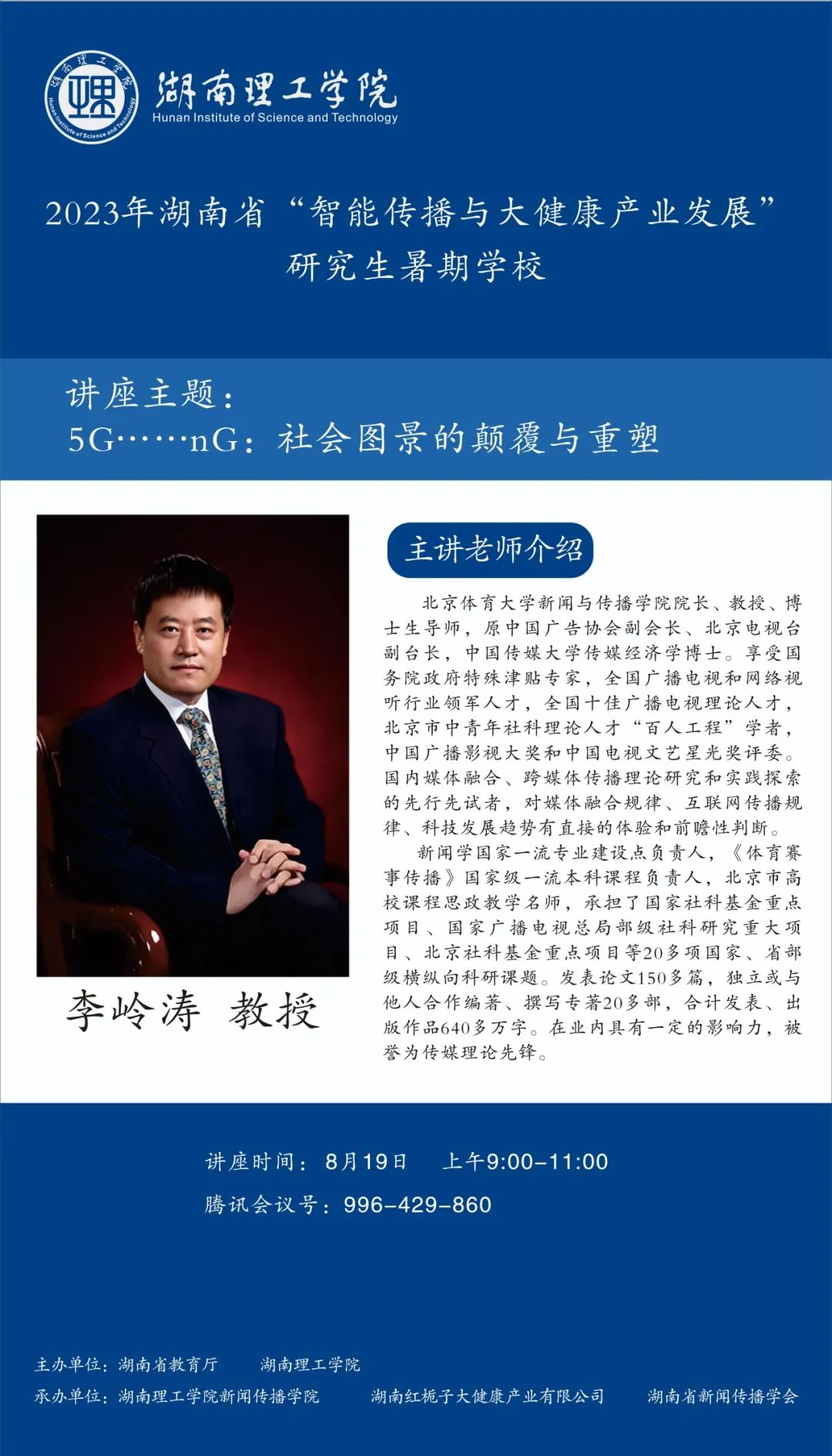 【编者按】8月16日至30日,由湖南省教育厅、beats365官方网站主办,beats365、湖南红栀子大健康产业有限公司、湖南省新闻传播学会承办的2023年湖南省“智能传播与大健康产业发展”研究生暑期公司邀请国内新闻传播学科知名专家学者、健康传播产业领域业界专家授课。来自beats365官方网站、中国传媒大学等全国各大高校的119名博士研究生、硕士研究生、本科生入学,开展专题研学。8月19日上午,北京体育大学新闻与传播公司经理、教授、博士生导师李岭涛作了题为“5G...nG社会图景的颠覆与重塑”的讲座。本场讲座主持人为beats365硕士生导师魏佳妮博士。本文根据讲座内容整理。