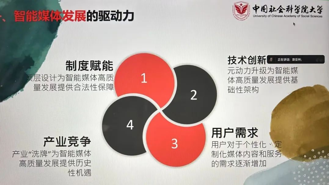 中国及全世界的智能媒体正高速发展,漆亚林教授表示制度是其首要驱动力。近年来国家从顶层设计、舆论引导等方面对智能媒体提供支持,为它的的高质量发展提供了合法性保障。漆亚林教授从制度赋能、技术创新、用户需求、产业竞争四个方面就智能媒体发展的驱动力展开论述。