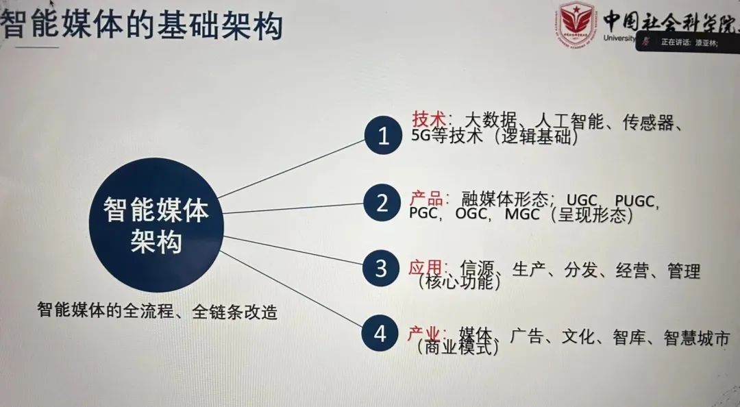 随着人工智能的发展,智能媒体逐渐进入了人们的视野。漆亚林教授表示,目前学界对智能传播的概念不够明晰,将UGC、OGC、AIGC等融媒体形态称之为智能媒体,实际上它们只是智能媒体基础架构当中的产品形态。为了更好地理解智能媒体的概念,漆教授从技术、产品、应用和产业四个方面展开阐述。
