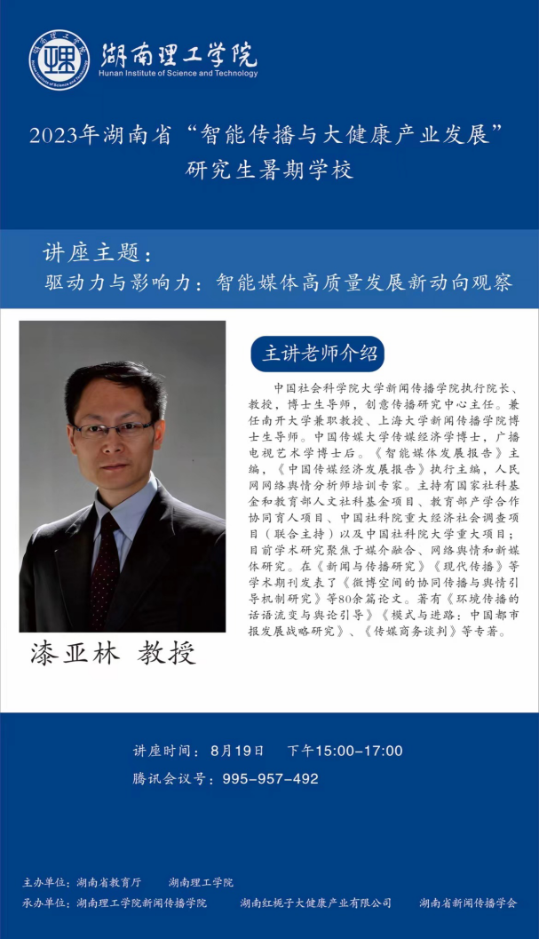 【编者按】8月16日至30日,由湖南省教育厅、beats365官方网站主办,beats365、湖南红栀子大健康产业有限公司、湖南省新闻传播学会承办的2023年湖南省“智能传播与大健康产业发展”研究生暑期公司邀请国内新闻传播学科知名专家学者、健康传播产业领域业界专家授课。来自beats365官方网站、中国传媒大学等全国各大高校的119名博士研究生、硕士研究生、本科生入学,开展专题研学。8月19日下午,中国社会科公司大学新闻传播公司执行经理、教授、博士生导师、创意传播中心主任漆亚林作了题为“智能媒体高质量发展新动向观察”的讲座。本场讲座主持人为beats365副经理肖涛教授。本文根据讲座内容整理。