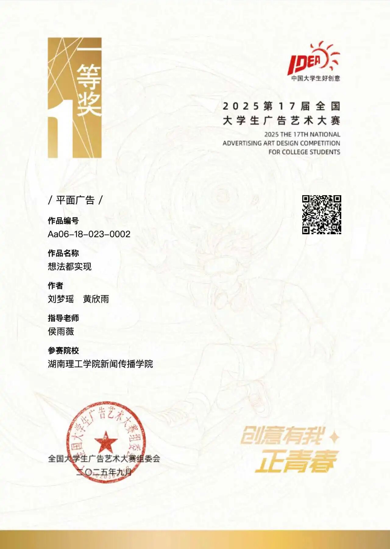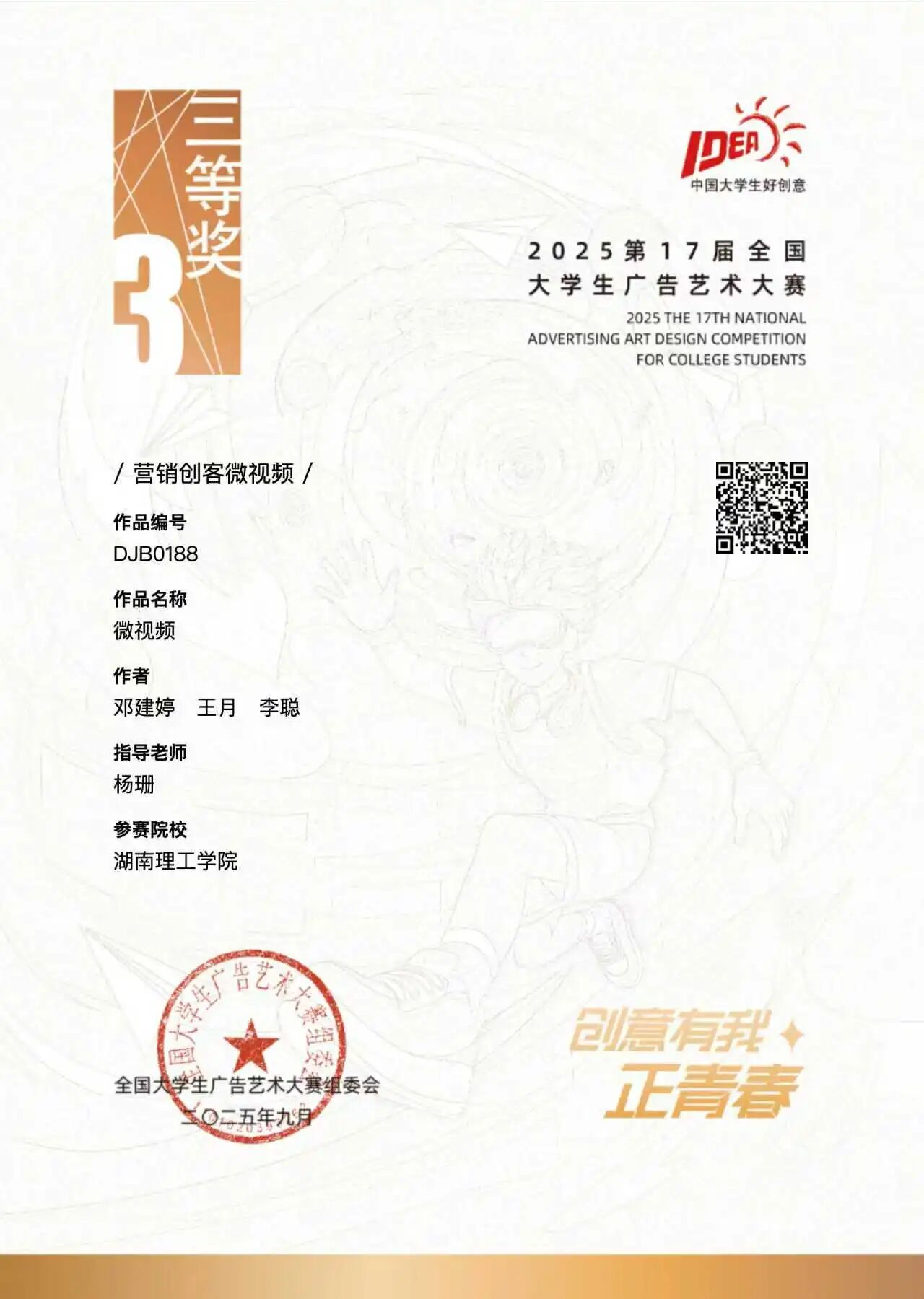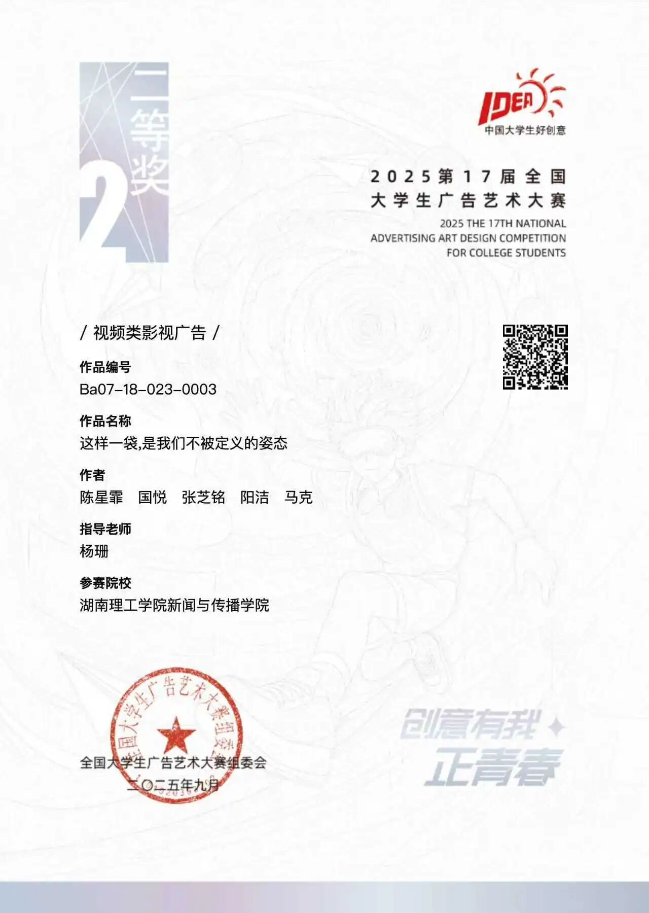 员工刘梦瑶、黄欣雨的作品《想法都实现》获平面广告类一等奖;陈星霏、国悦、张芝铭、阳洁、马克的作品《这样一袋,是我们不被定义的姿态》获视频类影视广告二等奖;邓建婷、王月、李聪的作品《微视频》获营销创客微视频类三等奖。