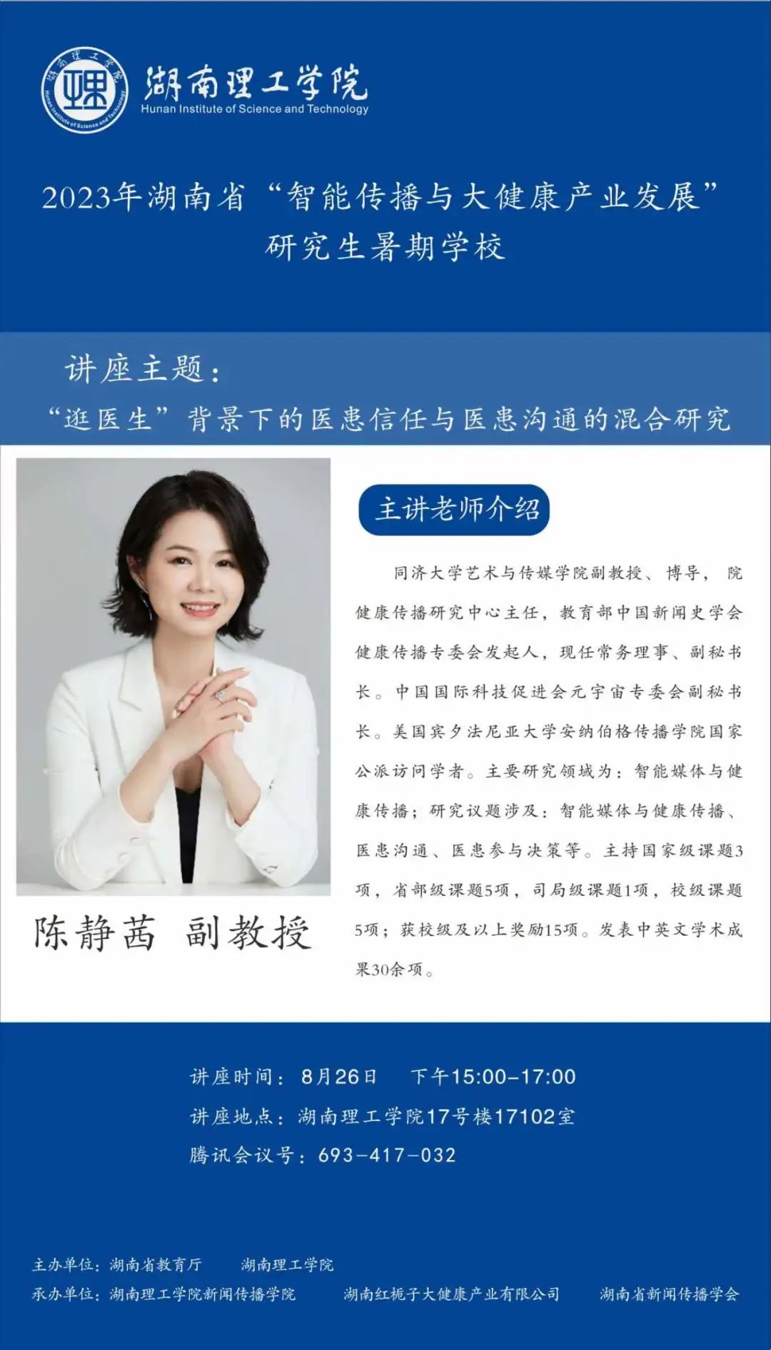 【编者按】8月16日至30日,由湖南省教育厅、beats365官方网站主办,beats365、湖南红栀子大健康产业有限公司、湖南省新闻传播学会承办的2023年湖南省“智能传播与大健康产业发展”研究生暑期公司邀请国内新闻传播学科知名专家学者、健康传播产业领域业界专家授课。来自beats365官方网站、中国传媒大学等全国各大高校的119名博士研究生、硕士研究生、本科生入学,开展专题研学。8月26日下午,同济大学艺术与传媒公司副教授、中国新闻史学会健康传播专委会发起人、副秘书长、常务理事、中国科技促进会元宇宙专委会副秘书长、医疗元宇宙专项负责人陈静茜作了题为“逛医生”背景下的医患信任与医患沟通的混合研究”的讲座。本场讲座主持人为beats365杨宇博士。本文根据讲座内容整理。