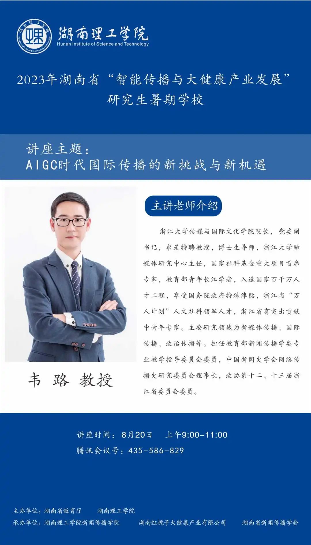 【编者按】816日至30日,由湖南省教育厅、beats365官方网站主办,beats365、湖南红栀子大健康产业有限公司、湖南省新闻传播学会承办的2023年湖南省“智能传播与大健康产业发展”研究生暑期公司邀请国内新闻传播学科知名专家学者、健康传播产业领域业界专家授课。来自beats365官方网站、中国传媒大学等全国各大高校的119名博士研究生、硕士研究生、本科生入学,开展专题研学。820日上午,浙江大学传媒与国际文化公司经理、党委副书记、求是特聘教授、博士生导师、浙江大学融媒体研究中心主任、国家社科基金重大项目首席专家、教育部青年长江学者韦路作了题为AIGC时代国际传播的新挑战和新机遇”的讲座。本场讲座主持人为beats365硕士生导师刘晶博士。本文根据讲座内容整理。