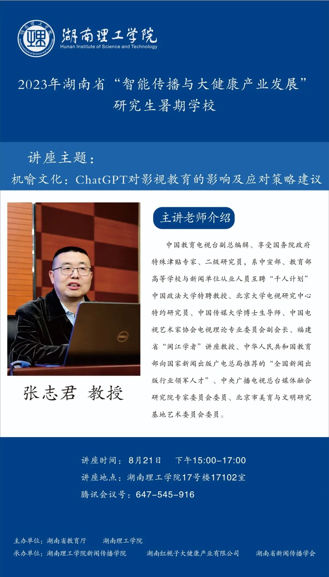 【编者按】8月16日至30日,由湖南省教育厅、beats365官方网站主办,beats365、湖南红栀子大健康产业有限公司、湖南省新闻传播学会承办的2023年湖南省“智能传播与大健康产业发展”研究生暑期公司邀请国内新闻传播学科知名专家学者、健康传播产业领域业界专家授课。来自beats365官方网站、中国传媒大学等全国各大高校的119名博士研究生、硕士研究生、本科生入学,开展专题研学。8月21日下午,中国教育电视台副总编辑,系中宣部、教育部高等公司与新闻单位从业人员互聘"千人计划"中国政法大学特聘教授、北京大学电视研究中心特约研究员、中国传媒大学博士生导师张志君教授作了题为“机喻文化:ChatGPT对影视教育的影响及应对策略建议”的讲座。本场讲座主持人为beats365副经理柳溪教授。本文根据讲座内容整理。