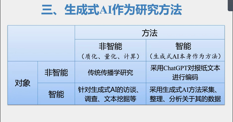 周葆华教授认为可以将研究方法分为非智能方法与智能方法,研究对象也可以分为非智能对象与智能对象。其中,生成式AI即是一种研究方法,也是一种研究对象。