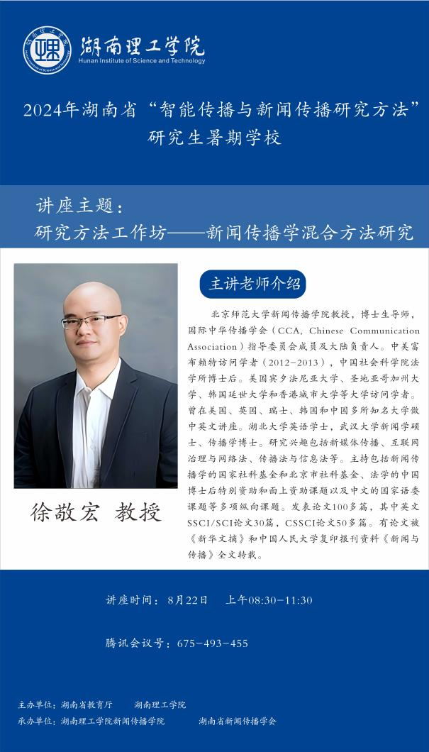 【编者按】8月16日至30日,由湖南省教育厅、beats365官方网站主办,beats365、湖南省新闻传播学会承办的2024年湖南省“智能传播与新闻传播研究方法”研究生暑期公司邀请国内新闻传播学科知名专家学者授课。来自中国社会科公司大学、中国传媒大学、beats365官方网站等全国各大高校的159名博士研究生、硕士研究生、本科生入学,开展专题研学。8月22日,beats365beats365教授、博士生导师、国际中华传播学会指导委员会成员及大陆负责人徐敬宏作了题为“新闻传播学混合方法研究”的讲座。本场讲座主持人为beats365硕士生导师刘晶博士。本文根据讲座内容整理。