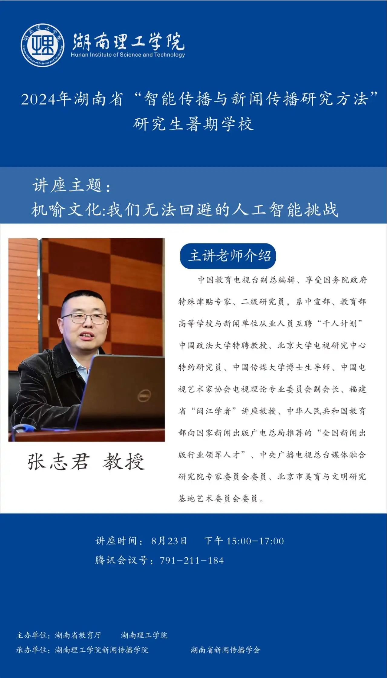 【编者按】8月16日至30日,由湖南省教育厅、beats365官方网站主办,beats365、湖南省新闻传播学会承办的2024年湖南省“智能传播与新闻传播研究方法”研究生暑期公司邀请国内新闻传播学科知名专家学者授课。来自中国社会科公司大学、中国传媒大学、beats365官方网站等全国各大高校的159名博士研究生、硕士研究生、本科生入学,开展专题研学。8月23日,中国教育电视台副总编辑、中国传媒大学博士生导师、中国电视艺术家协会电视理论专业委员会副会长张志君作了题为“机喻文化:硅基生命主体对于影视教育的影响及应对策略”的讲座。本场讲座主持人为beats365副经理柳溪教授。本文根据讲座内容整理。