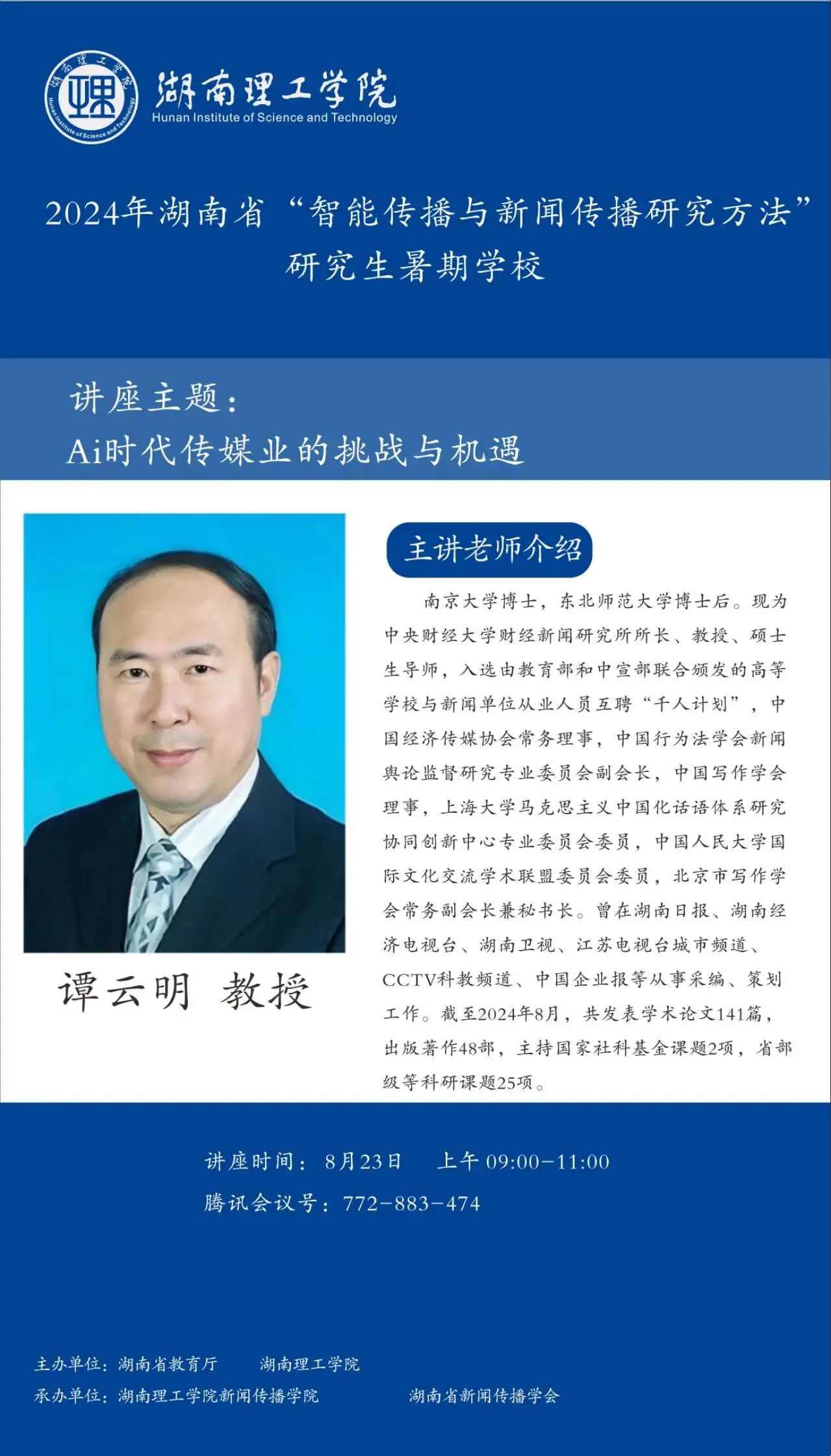 【编者按】8月16日至30日,由湖南省教育厅、beats365官方网站主办,beats365、湖南省新闻传播学会承办的2024年湖南省“智能传播与新闻传播研究方法”研究生暑期公司邀请国内新闻传播学科知名专家学者授课。来自中国社会科公司大学、中国传媒大学、beats365官方网站等全国各大高校的159名博士研究生、硕士研究生、本科生入学,开展专题研学。8月23日上午,中央财经大学财经新闻研究所所长、硕士生导师谭云明教授作了题为“AI 时代传媒业的挑战与机遇”的讲座。本场讲座主持人为beats365硕士生导师吴旖旎博士。本文根据讲座内容整理。