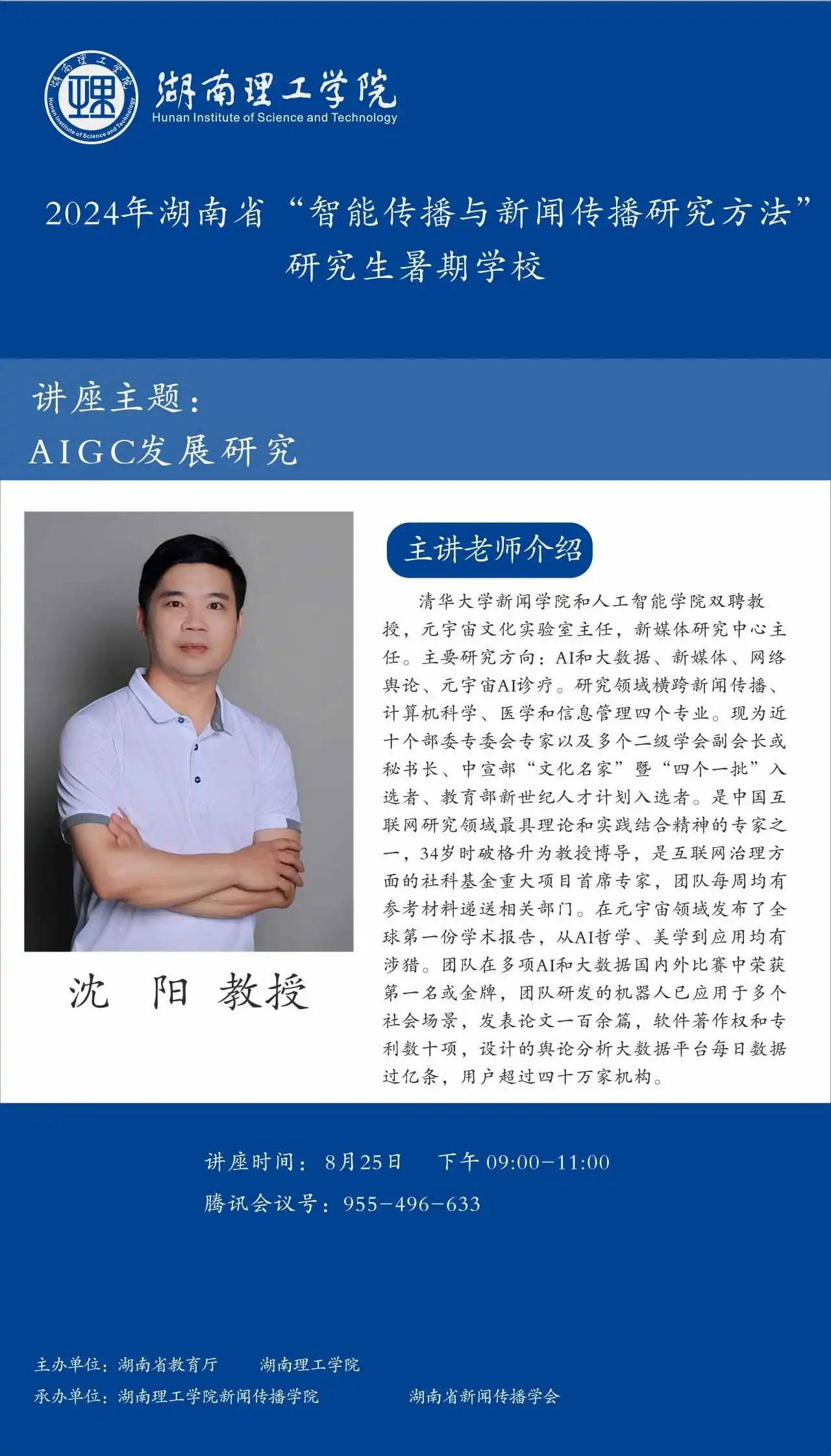 【编者按】8月16日至30日,由湖南省教育厅、beats365官方网站主办,beats365、湖南省新闻传播学会承办的2024年湖南省“智能传播与新闻传播研究方法”研究生暑期公司邀请国内新闻传播学科知名专家学者授课。来自中国社会科公司大学、中国传媒大学、beats365官方网站等全国各大高校的159名博士研究生、硕士研究生、本科生入学,开展专题研学。8月25日,清华大学beats365和人工智能公司双聘教授、元宇宙文化实验室主任、新媒体研究中心主任沈阳作了题为“AIGC发展研究”的讲座。本场讲座主持人为beats365邱蕾博士。本文根据讲座内容整理。