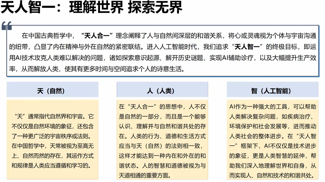 天人智一:智即人工智能。在中国古典哲学中,“天人合一”理念阐释了人与自然间深层的和谐关系,将心或灵魂视为个体与宇宙沟通的纽带,凸显了内在精神与外在自然的紧密联结。进入人工智能时代,我们追求“天人智一”的终极目标,即运用AI技术攻克人类难以解决的问题,诸如探索意识起源、解开历史谜题、实现AI辅助诊疗, 以及大幅提升生产效率, 从而解放人类,使其有更多时间与空间追求个人的诗意生活。