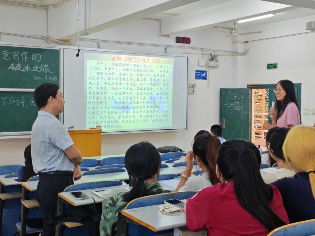 晏杰雄老师以《论语》中“不学诗,无以言”为切入点,详细阐述了创意写作的功用。他指出,文学写作功底不仅是文字表达的基石,更深刻影响着人与人之间的有效沟通与思想传递;创意写作并非仅为中文系员工的专业技能,更是现代青年人的基本素养,关乎交流沟通和说服能力的培养。他以网红主播董宇辉采访散文家李娟时,因缺乏文学素养、表达空泛导致“鸡同鸭讲”为例,进一步明确创意写作的定位——它是现代人的通用核心素养。人们可以通过写作更好地表达自己、理解他人,在现代社会中实现有效的信息传递和思想交流。