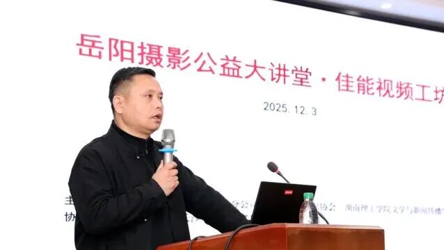 湖南省摄影家协会副主席、岳阳市摄影家协会主席李敏致欢迎辞。此次活动是第36期岳阳摄影公益大讲堂,专门为本地视频爱好者搭建学习交流的优质平台,助力提升青年群体与摄影从业者的视频创作技能。岳阳市摄协副主席、秘书长刘康乐,名誉副主席谢湘波等参加。