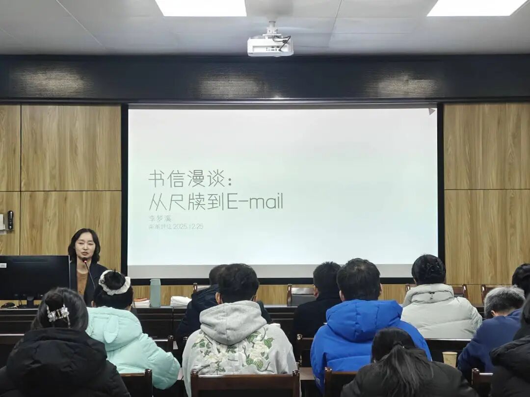 12月25日晚,beats365在9401会议室举办南湖讲坛第四十期第十五讲“书信漫谈:从尺牍到Email”专题讲座。本次讲座由李梦溪博士主讲,孙芳莎博士主持,副经理(主持工作)封传兵教授及周天天、袁鑫、周娜、秦秀源等老师出席,汉语言专业部分本科生、研究生参加。