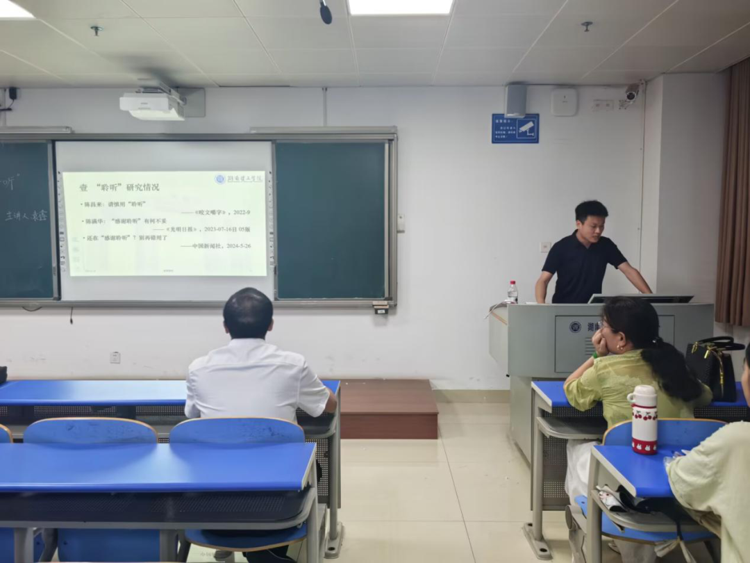 讲座伊始,袁鑫博士以日常PPT演示文稿中的结束语“感谢聆听”为切入点,以小见大,详细地解析了“聆听”一词。通过字形演变考据、近义词辨析、语义搭配分析及学术观点探讨等多个维度,他对该词语进行了系统化阐述。袁博士不仅梳理了“聆听”一词在汉语史中的使用流变,还以此为观察窗口,展现了不同学术思潮之间的碰撞与融合。此外,他还与现场同学就“聆听”的语用得体性展开了热烈讨论,激发了师生对语言规范与发展的深刻思考。