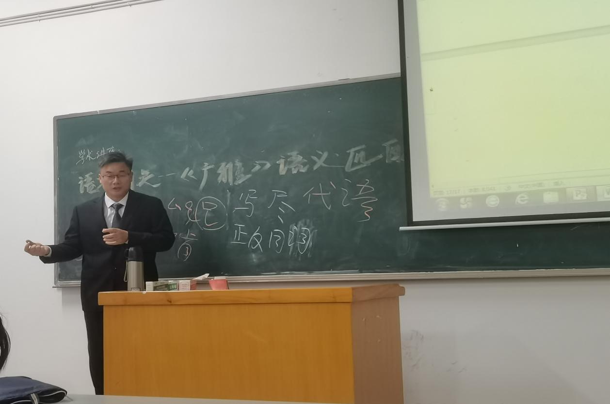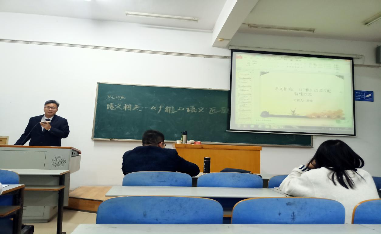 肖峰从“题解、《广雅》中语义相关论述及补充、语义相关到语义相似初探”三方面展开讲座,系统论述了语义相关--语义匹配特殊方式的意义与来源。肖峰首先就《广雅》一书的来源与作者拉开语义相关的序幕。随后,他指出语义匹配特殊方式的问题来源,提出语义相关和语义相似两个概念,并将二者进行比较,使同学们深入了解语义相关的意蕴。