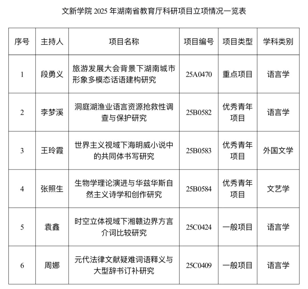 近日,湖南省教育厅正式公布2025年度科学研究项目立项结果,beats365教师凭借深厚的学术积累,在本次申报工作中表现突出,共计获批立项6项,含重点项目1项、优秀青年项目3项、一般项目2项。