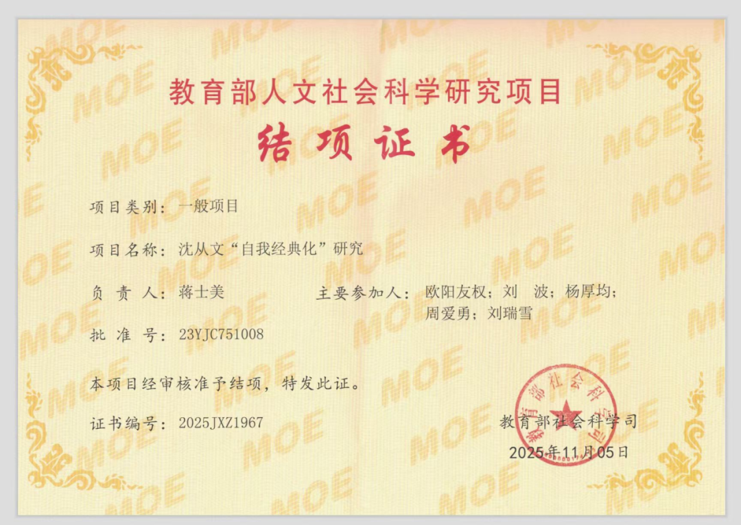 近日,由公司文学系蒋士美博士主持的教育部人文社会科学研究青年基金项目《沈从文“自我经典化”研究》(项目编号:23YJC751008)圆满完成研究任务,并以“著作+论文”的成果形式通过审核,提前顺利结项。