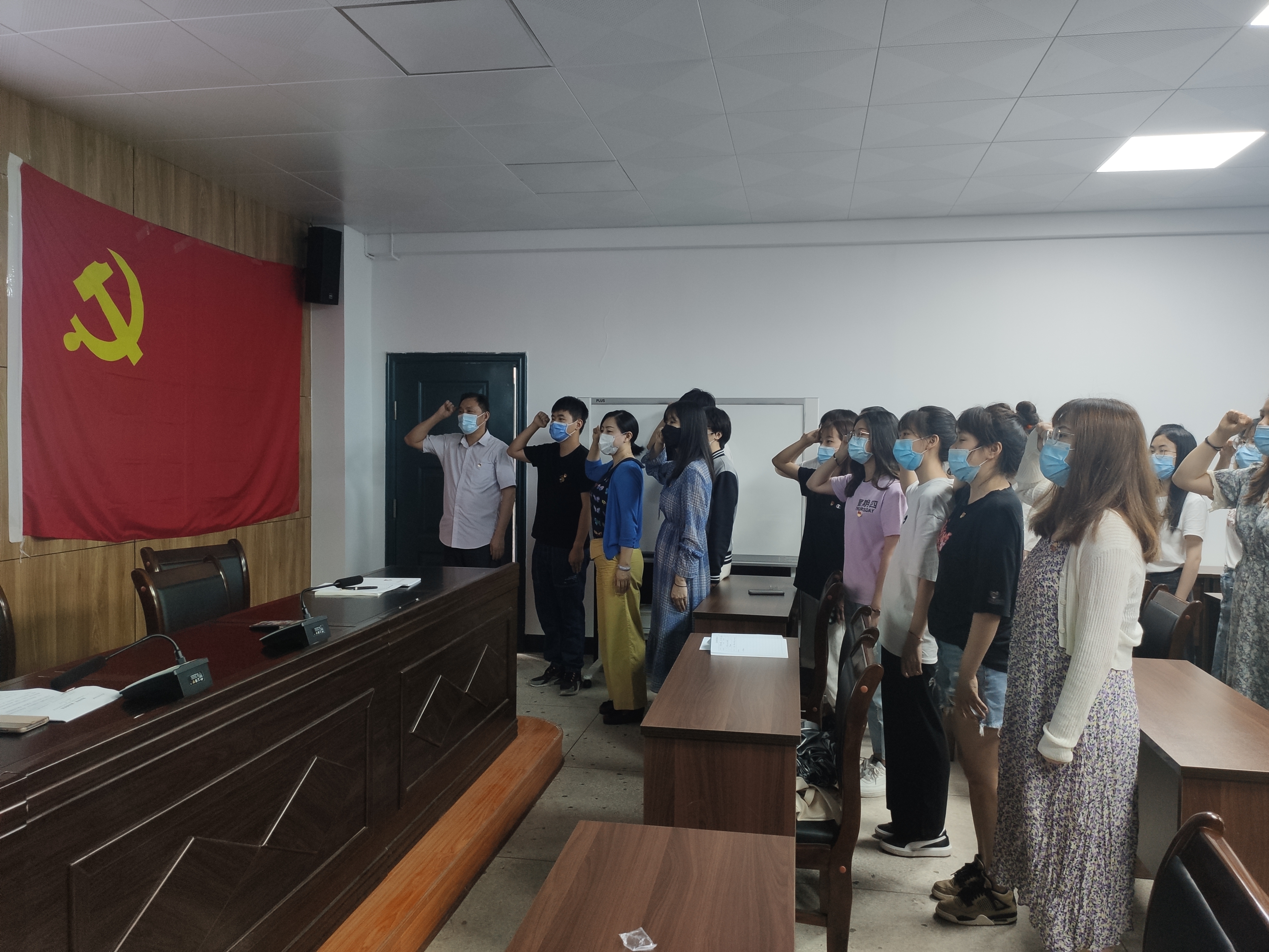 大会开始,全体起立奏唱国歌,全体老师、员工党员由潘昕领誓重温入党誓词。