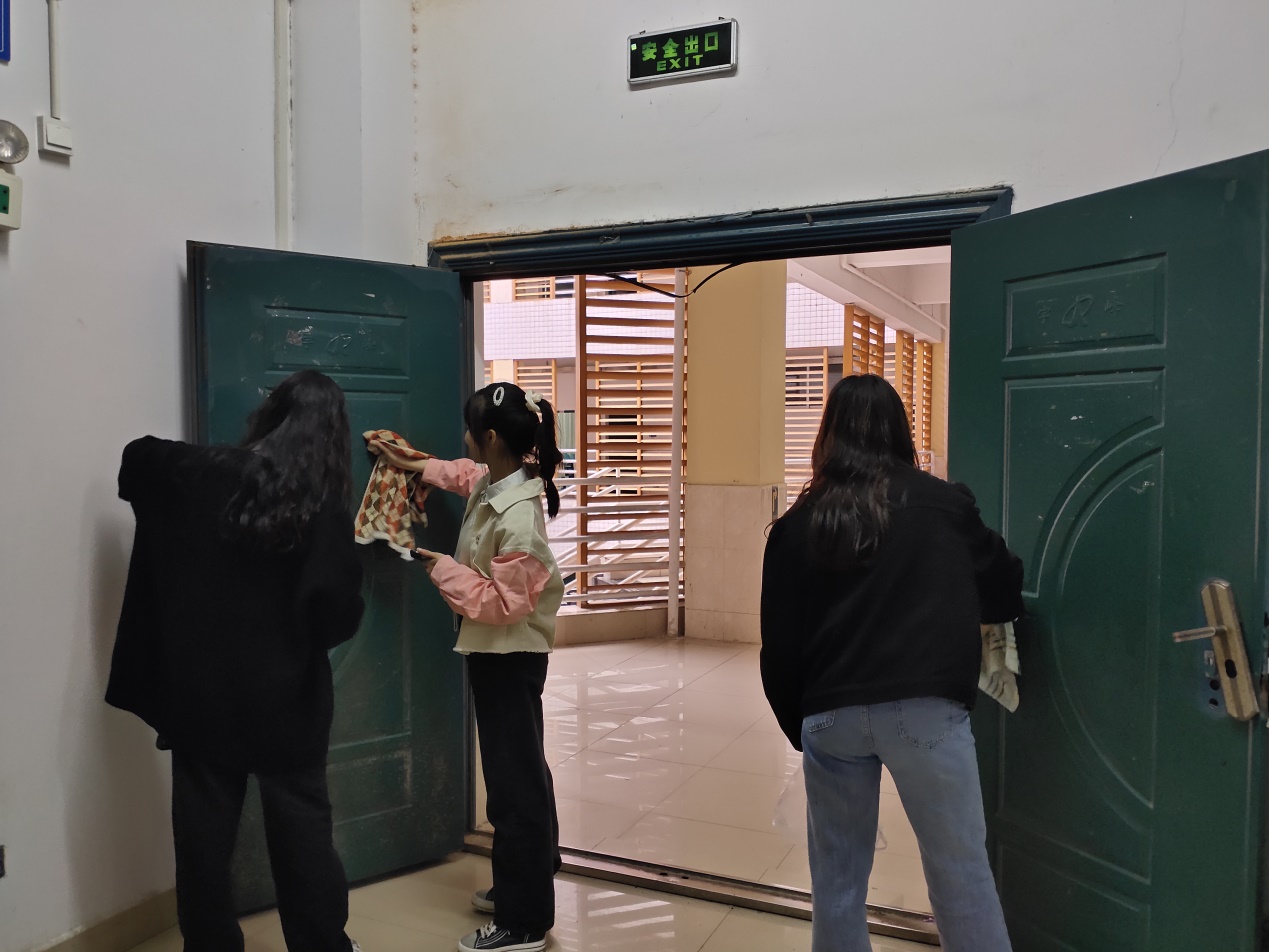 尽管气温骤降,还下着蒙蒙细雨,同学们依然满怀热情,将15号教学楼所有的黑板和教室门清理干净。