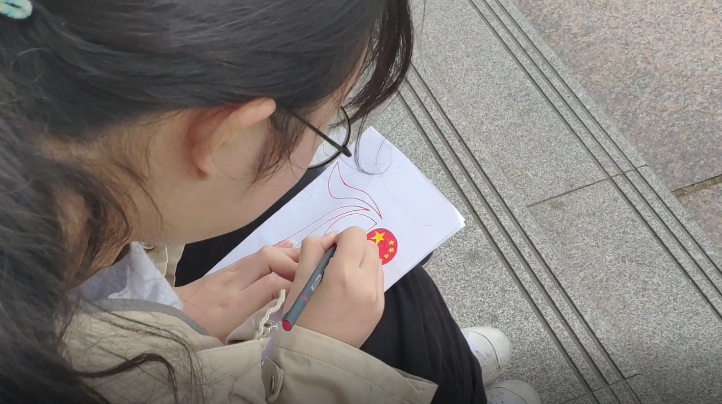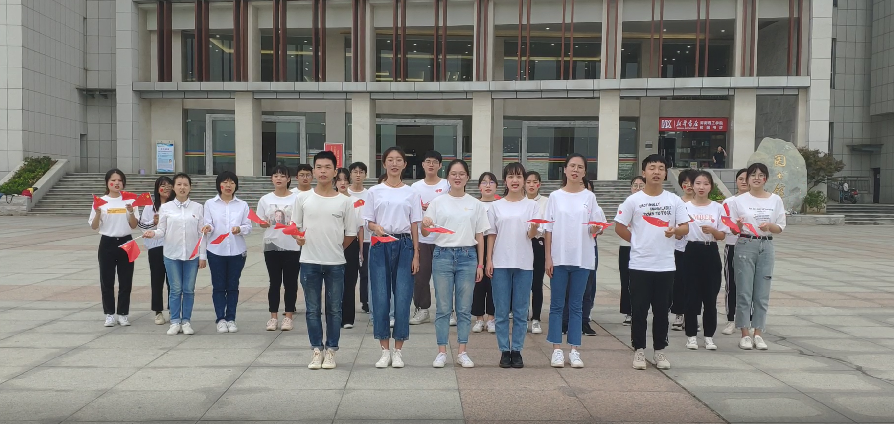 9月18日上午,18级新闻1班在南院图书馆前坪录制《我爱你,中国》合唱视频。手持小红旗、身贴“中国心”的同学们在升旗台前放声高唱“我爱你中国,心爱的母亲……”,歌声和红旗随风飘荡在空中,吸引了许多来往图书馆的同学驻足观看。