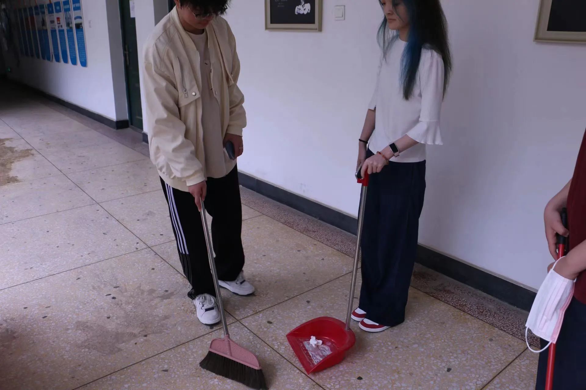 在团学负责人的组织下,同学们有序领取工具、分工合作,按要求清扫了9栋4楼、5楼的楼梯间、走廊以及因暴雨产生积水的地面,并擦拭了走廊周围的扶手。