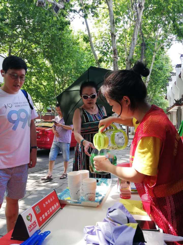 今年端午恰逢高考,志愿者们为岳阳市一中考点的考生及其家长们送上水和防暑药品,帮助街道办维持考点周边秩序。