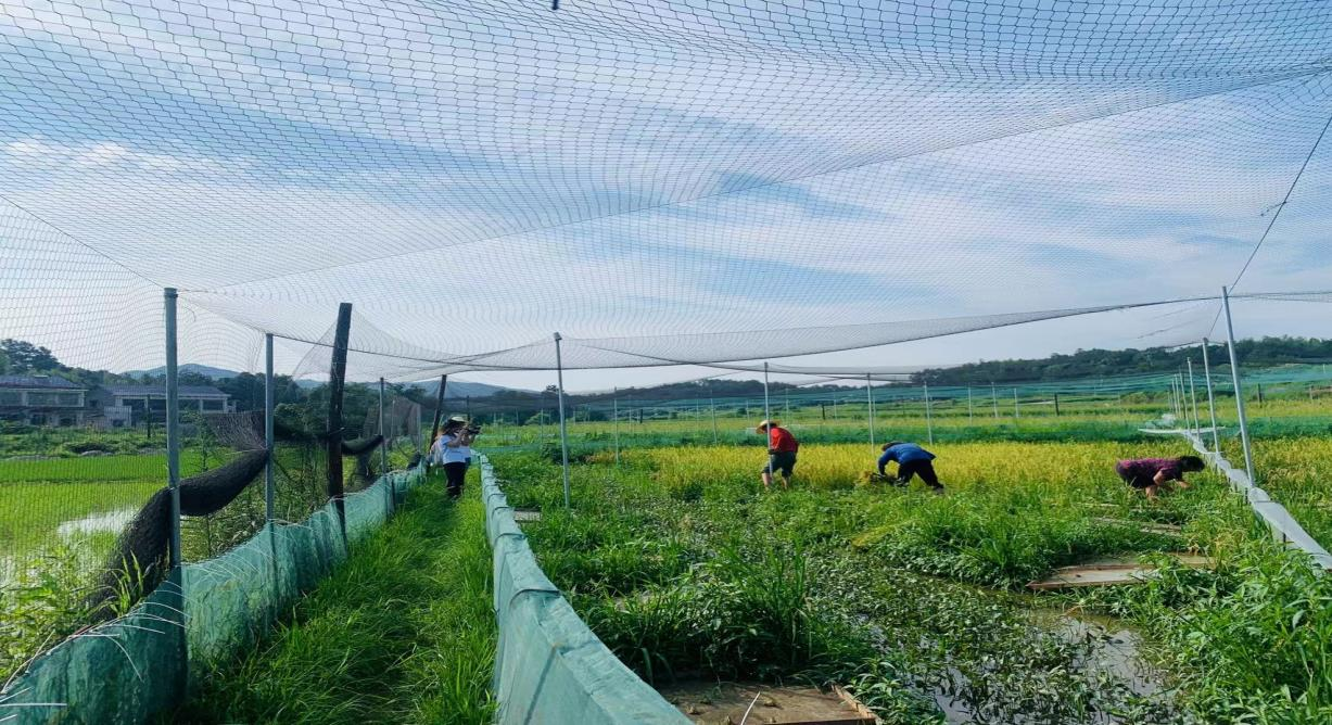 “稻花香里说丰年,听取蛙声一片。”走进向家镇望湖村“稻田养蛙”试验田,映入眼帘的是一大片金黄的稻田,四周围起的蓝色纱帐下,蛙声起此彼伏,欢乐歌唱。
