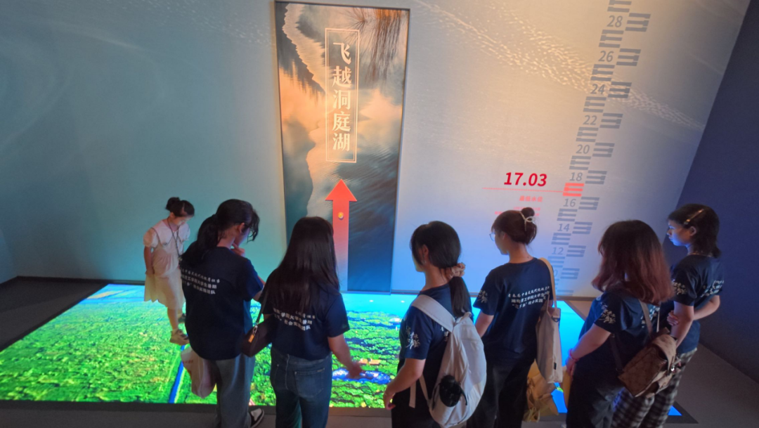 庭湖博物馆为师生们展开了一幅生态与人文交织的壮丽画卷。从史前文明的遗迹到历代文人墨客吟咏洞庭的华章,从国家级非遗“洞庭渔歌”的悠扬旋律到独特的渔耕民俗,特别是重点考察的“麋鹿倩影”、“江豚乐园”、“候鸟天堂”以及“君山荷花世界”等特色生态文化展区,系统呈现了洞庭湖作为“鱼米之乡”和“生态宝库”的独特魅力。师生们驻足于“君山荷花世界”的展示前,孙聚荣讲解道:“‘莲’在湖湘文化中寓意高洁,周敦颐《爱莲说》便诞生于此。这接天莲叶不仅是一景,更是湖湘文人精神品格的象征,与‘清水绿岸’生态之美一脉相承。从屈原行吟泽畔的忧思,到范仲淹‘先忧后乐’的情怀,其精神源头都与这方水土息息相关。”员工曾妍在聆听完原生态的“洞庭渔歌”后感慨:“课本上的‘渔歌互答’是静态的文字,而此刻听到的旋律、看到的渔具、感受到的荷风莲韵,让‘巴陵胜状’活了起来。作为中文人,我们有责任挖掘、记录和传播这些承载着湖湘生态智慧的独特文化符号,让文脉在绿水青山间生生不息。