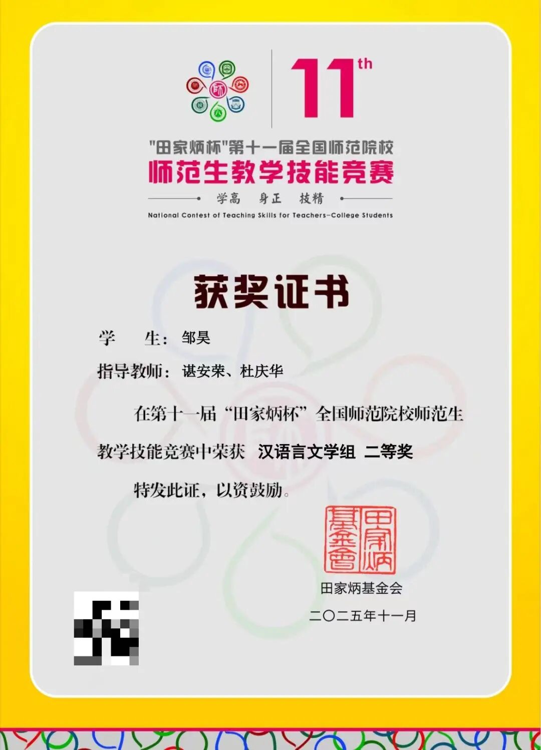 近日,第11届“田家炳杯”全国师范院校师范生教学技能竞赛决赛在浙江师范大学圆满落幕。经过初赛和决赛两轮激烈的竞争,beats365汉语23-2BS班邹昊同学脱颖而出,凭借出色的专业素养和沉稳的现场发挥,荣获汉语言文学组二等奖。