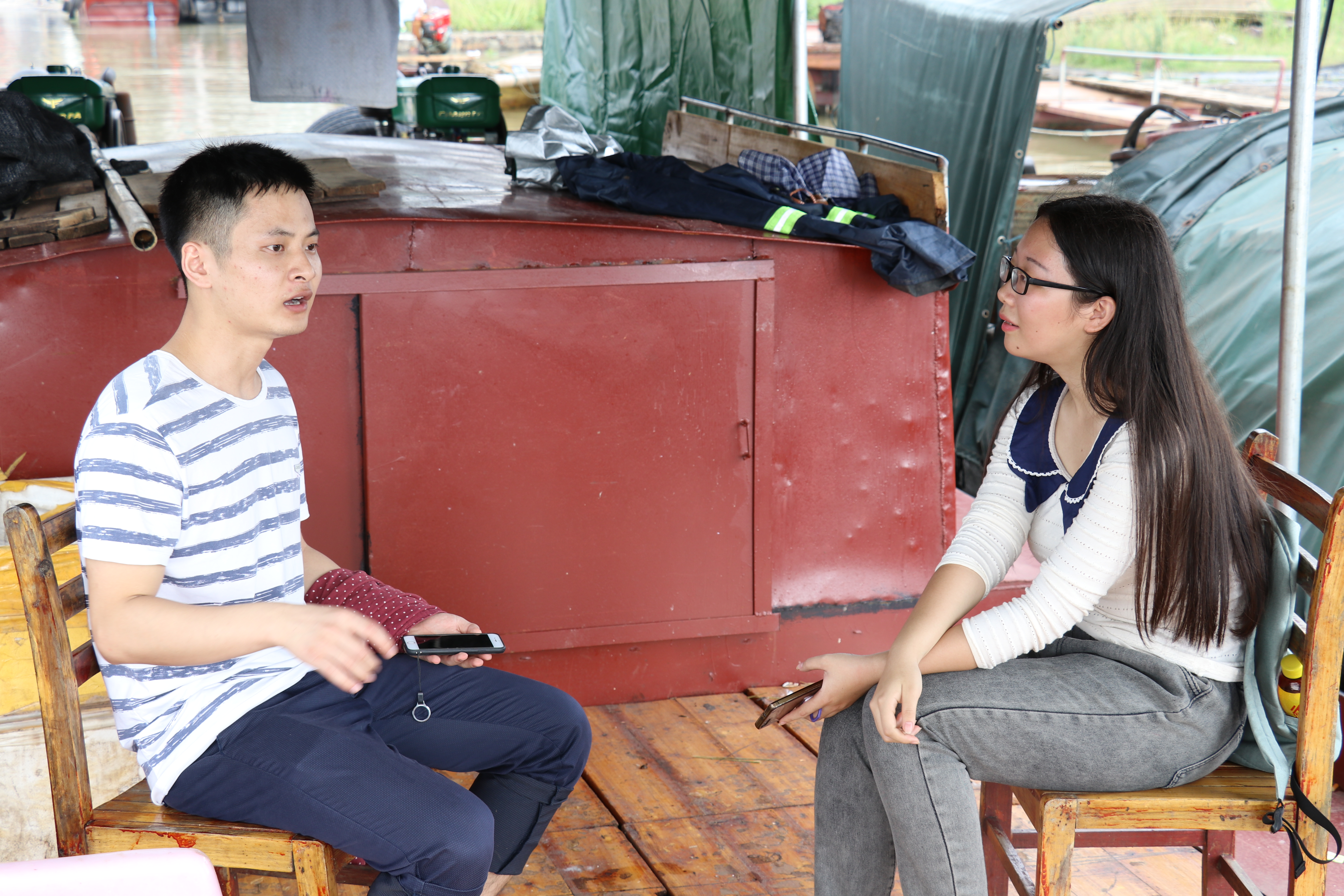 一路颠簸之后,我们再一次来到了那个熟悉而又陌生的地方——洞庭渔船码头。码头似乎比平常热闹了不少,走近了才发现原来今天就是所谓的“开湖期”,各大渔民都在不停地捯饬自己的渔船,脸上洋溢着激动与欣喜。在渔船上寻思了半天,一位看似与我们相差无几的年轻小伙映入我们的视线,仿佛是心有灵犀一般,他也朝我们走了过来。一番了解之后惊奇地发现原来他是一位渔民人的孩子,这样突如其来的惊喜令我们喜出望外,并表态很乐意为我们解答疑惑。