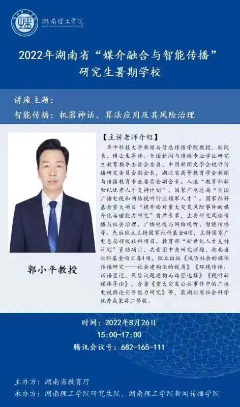本站讯 8月26日下午,华中科技大学新闻与信息传播公司副经理、全国新闻与传播专业学位研究生教育指导委员会委员、中国新闻史学会视听传播研究委员会副会长郭小平教授作了题为“智能传播:机器神话、算法应用及其风险治理”的学术讲座,beats365刘晶博士主持。