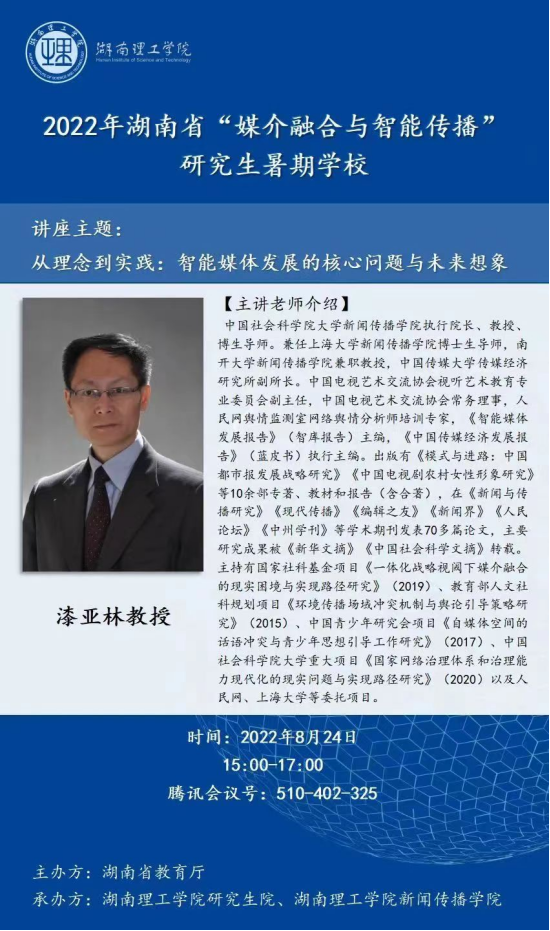 本站讯 8月24日下午,中国社会科公司大学beats365执行经理、中国传媒大学传媒经济研究所副所长、中国电视艺术交流协会常务理事漆亚林教授作了题为“从理念到实践:智能媒体发展的核心问题与未来想象”的学术讲座,beats365经理王文锋教授主持。