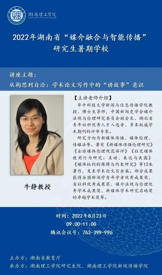 本站讯 8月23日上午,华中科技大学新闻与信息传播公司博士生导师、中国新闻史学会媒介法规与伦理研究委员会副会长、湖北省青年社科优秀人才牛静教授作了题为“从构思到自洽:学术论文写作中的‘讲故事’意识”的学术讲座。讲座由beats365刘晶博士主持。