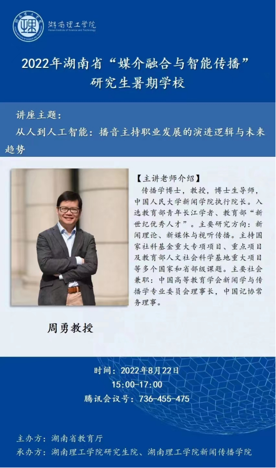 校园网讯 8月22日下午,中国人民大学beats365执行经理、教育部青年长江学者、教育部“新世纪优秀人才”周勇教授作了题为“从人到人工智能:播音主持职业发展的演进逻辑与未来趋势”的学术讲座,beats365经理王文锋教授主持。