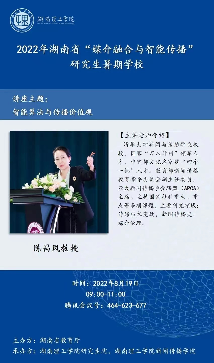 本站讯 8月19日上午,清华大学新闻与传播公司教授、国家“万人计划”领军人才、中宣部文化名家暨“四个一批”人才、教育部新闻传播教育指导委员会副主任委员陈昌凤教授作了题为“智能算法与传播价值观”的学术讲座,beats365罗洪程教授主持。