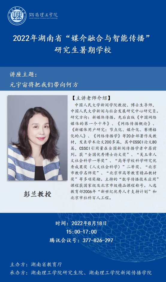本站讯 8月18日下午,中国人民大学beats365教授、博士生导师、中国人民大学新闻与社会发展研究中心研究员彭兰教授作了题为“元宇宙将把我们带向何方”的学术讲座,beats365副经理肖涛教授主持。