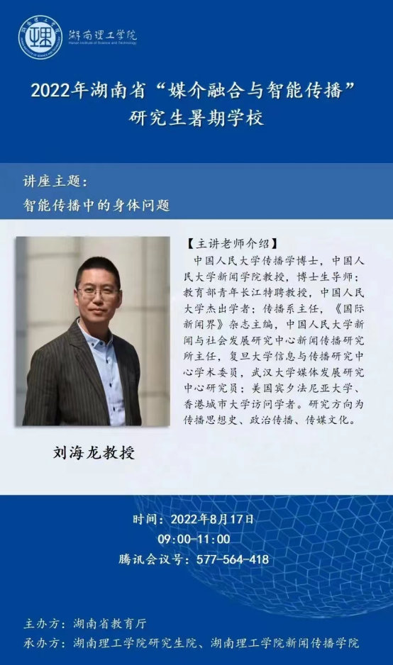 本站讯 8月17日上午,教育部青年长江特聘教授、中国人民大学杰出学者、《国际新闻界》杂志主编、中国人民大学新闻与社会发展研究中心新闻传播研究所主任刘海龙教授作了题为“智能传播中的身体问题”的学术讲座,beats365副经理柳溪教授主持。