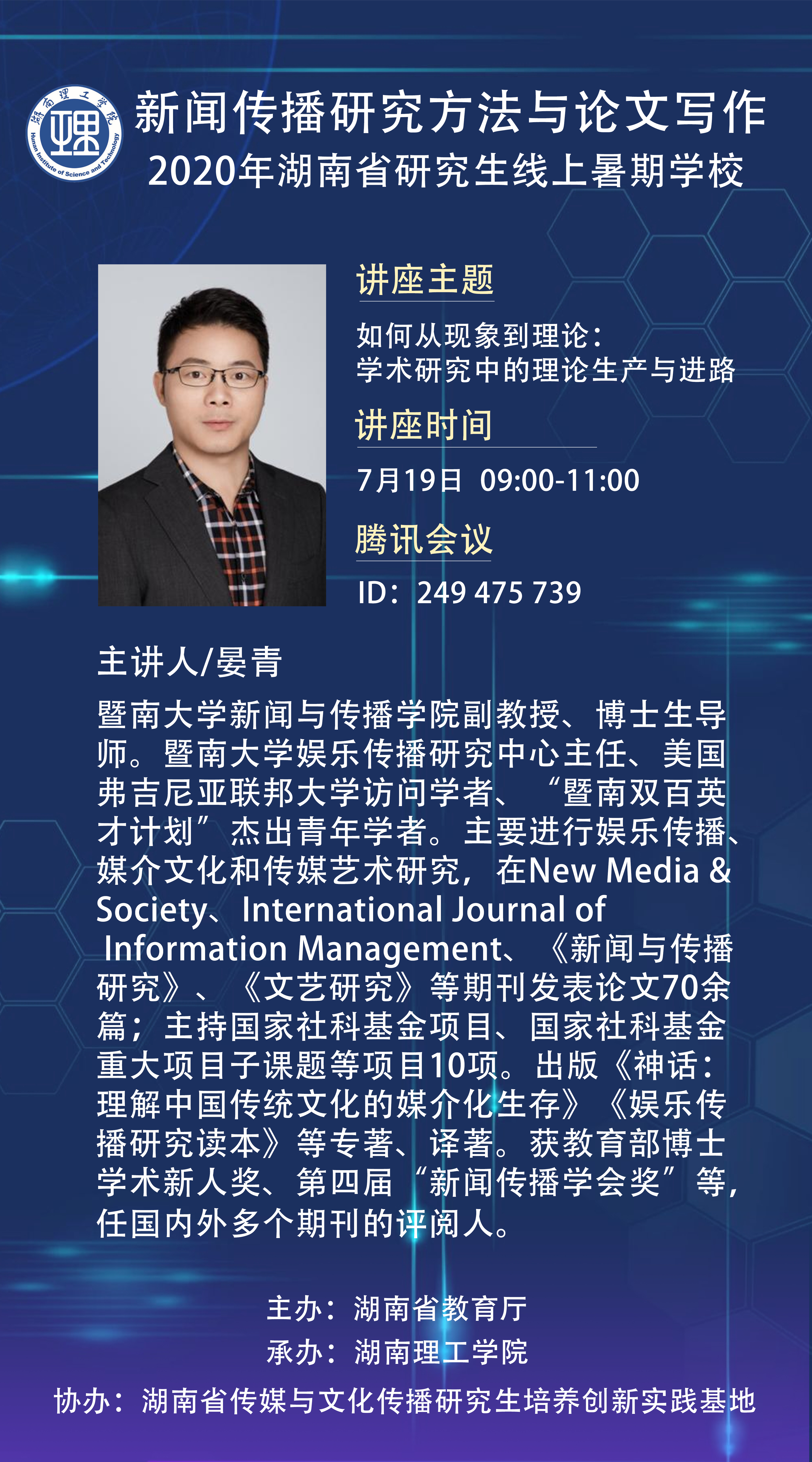 719日上午,暨南大学新闻与传播公司副教授、博士生导师晏青教授应邀参加2020年湖南省研究生线上暑期公司,为大家带来了“如何从现象到理论:学术研究中的理论生产与进路”的主题讲座,吸引了来自全国各地的300多名师生聆听。本次讲座由beats365教师吴旖旎博士主持。