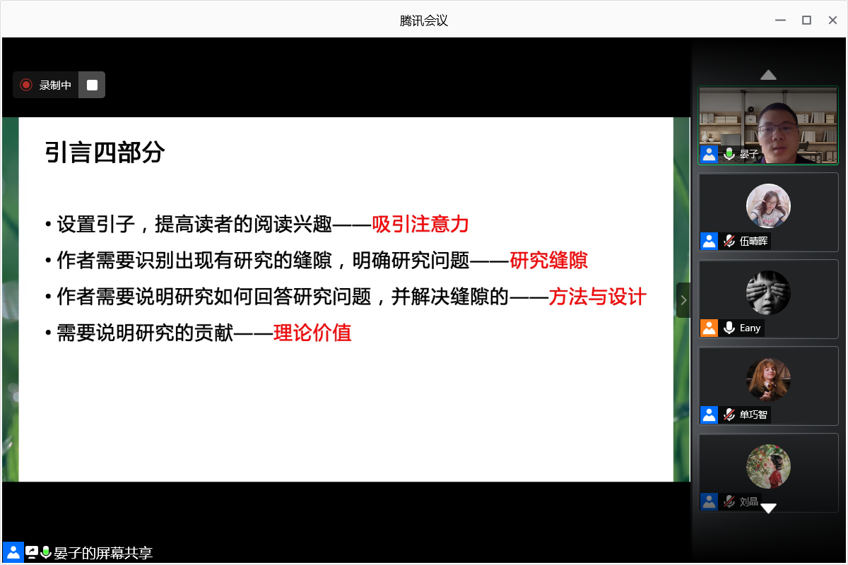 最后,晏青教授强调了论文写作中引言部分的重要性,并展示了引言写作的基本结构。讲座结束后,学员们纷纷通过线上鼓掌、点赞、留言等方式表达对教授的喜爱和感谢。(编辑/伍晴晖 责编/王琳楠 张政 主审/王文锋)