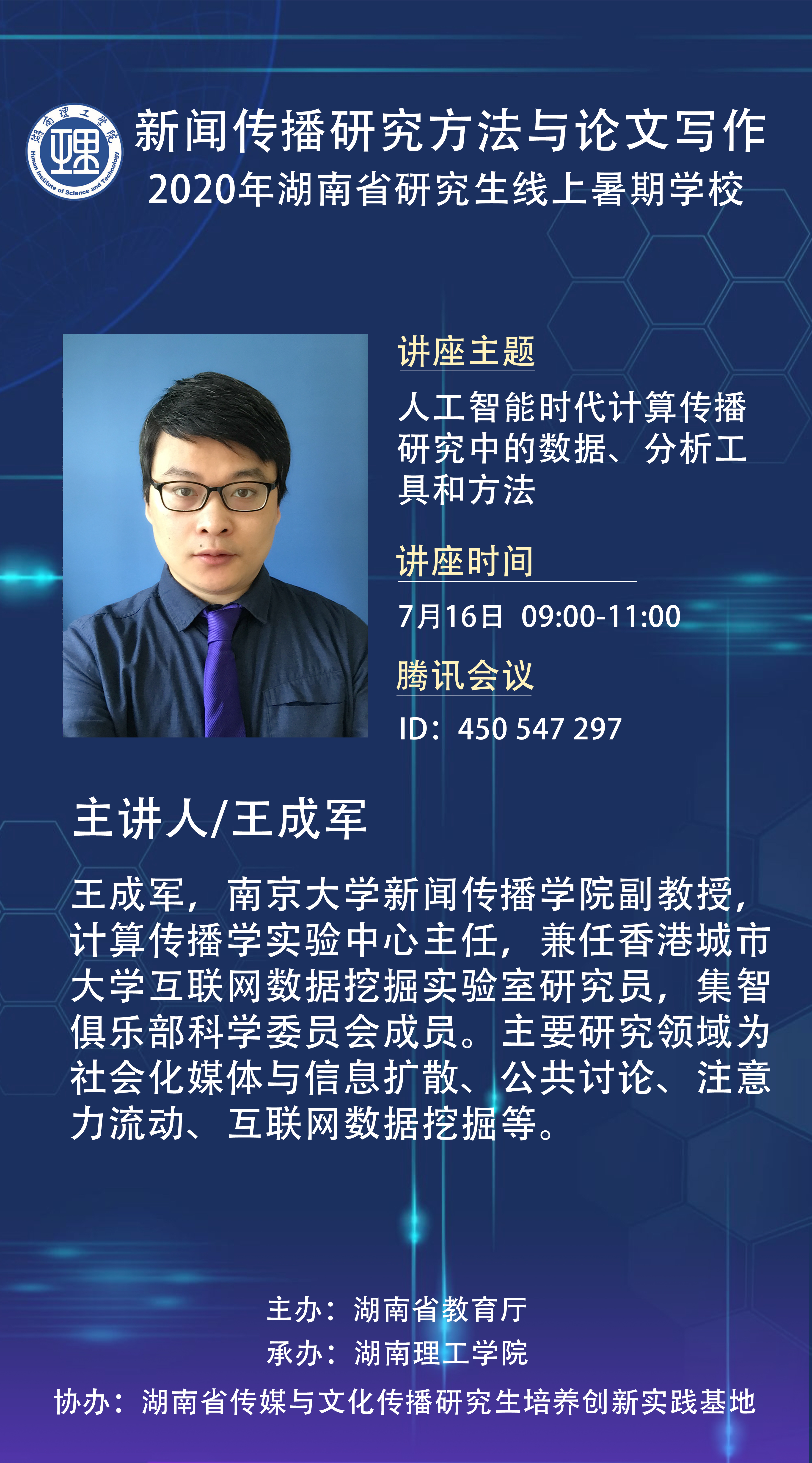 2020716日上午9点,南京大学beats365副教授、计算传播学实验中心主任王成军应邀为2020湖南省研究生线上暑期公司的学员们带来了一场题为“人工智能时代计算传播研究中的数据、分析工具和方法”的前沿讲座。
